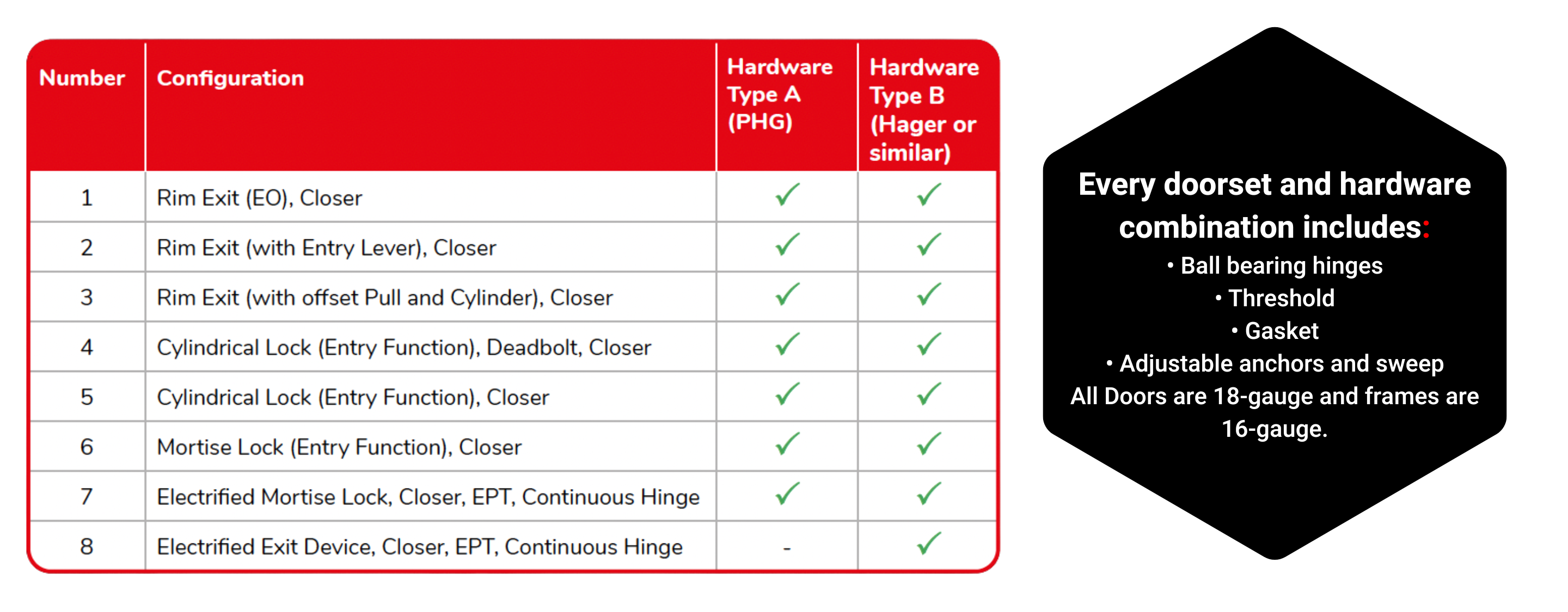 Type B - This is our best selling hardware category utilizing Hager Hinge Company for almost all options. All hardware is supplied in 32D Stainless and Closers are all Power 6. Hager has been a leading independent American Hardware manufacturer for over 175 Years.